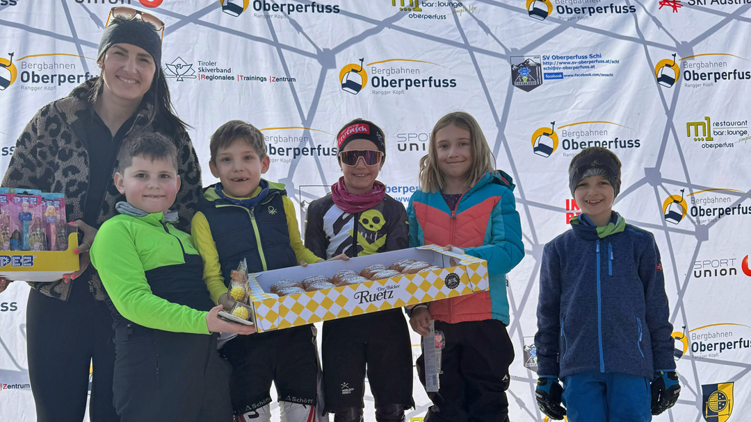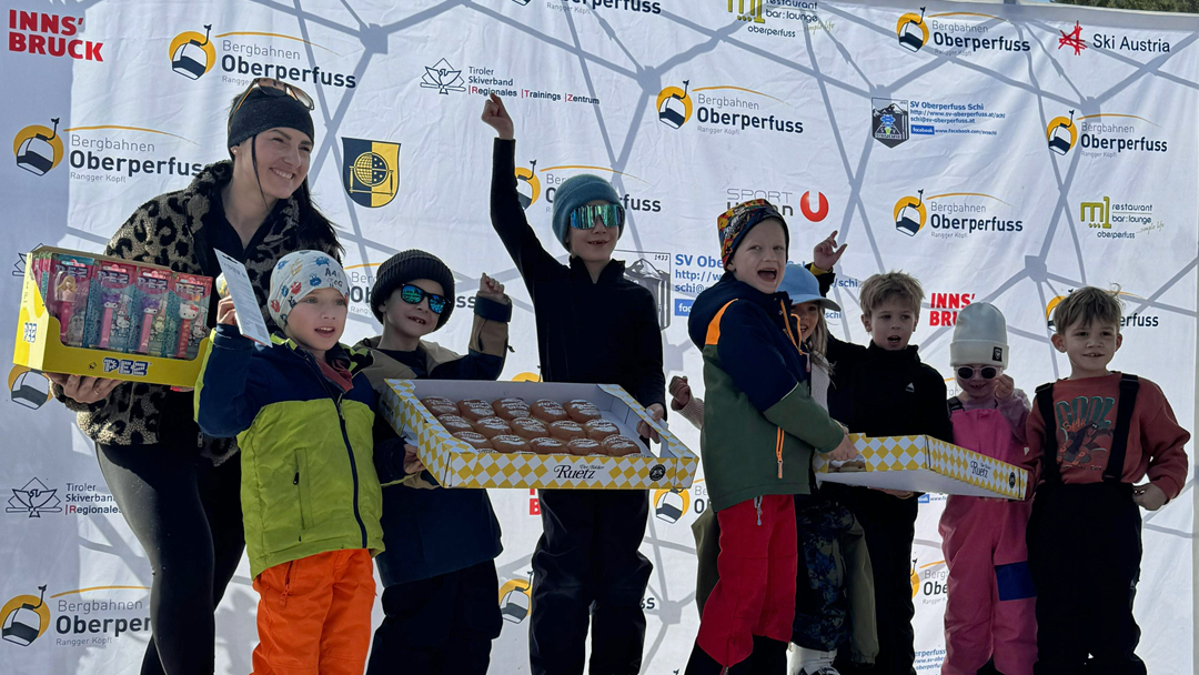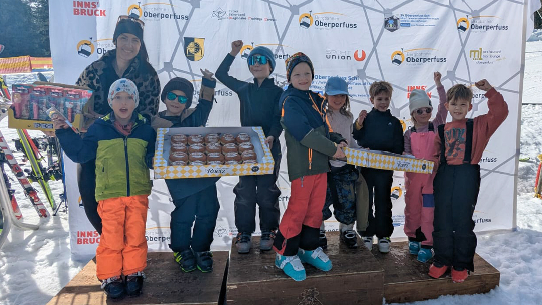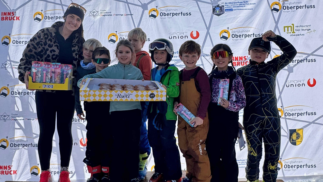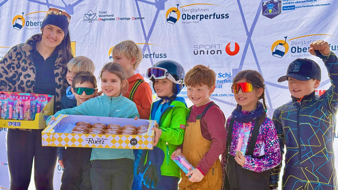 Am heutigen Samstag wurde bei traumhaftem Sonnenschein der VENIERcup der Volksschulen Oberperfuss am Rangger Köpfl durchgeführt. Dieses Highlight für die Kinder der Volksschulen Oberperfuss Dorf und Oberperfuss Berg bildet den jährlichen Abschluss für unser gemeinsames Schiprojekt „Oberperfuss fährt Schi“ welches den Winter hindurch den Kindern am Nachmittag das Schifahren ermöglicht. Dabei helfen die Kooperationspartner SV Oberperfuss Schi, die Bergbahnen Oberperfuss, die Schischule Kleissl Hannes und natürlich alle Lehrer und Lehrerinnen zusammen und verlegen einen Teil der Turnstunden auf die Piste. Unter der Aufsicht von Weltmeisterin & Projektpatin Stephi Venier, Rennleiter Venier Mario (Papa) wurde diesmal Premiere auf der der VENIER Goldpiste gefeiert! Der selektiv ausgeflaggte Riesentorlauf wurde anschließend Klassenweise (Schulklasse 😉) gemeinsam befahren und zusammen als Schulklasse eine Zeit gerechnet (die top3 Zeiten). Als Preise erhielten alle Kinder eine Palette eigens kreierte Venierkrapfen vom Bäcker Ruetz und zusätzlich noch Goodies von PEZ Österreich! Die „schnellste Klasse“ aus Oberperfuss wurde diesmal die Klasse 4b der VS Dorf, welche sich sodann die eigens kreierte Torflagge für ihr Klassenzimmer sicherte. Die schnellste Damen Zeit sicherte sich Clea TRIENDL der 2a Dorf, die schnellste Herren Zeit Neo HUJARA der 4a Dorf.